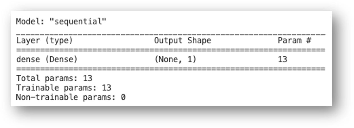model.summary()로 기계 학습 모델의 정보를 확인하면 13개의 Parameter로 구성되어 있고, 입력은 12개의 dim 이고, 최종 output shape 은 1차원입니다. model.compile() 함수를 통해서 loss 함수를 정의하고, loss 함수를 최적화하는 parameter를 model.fit() 함수로 찾습니다.