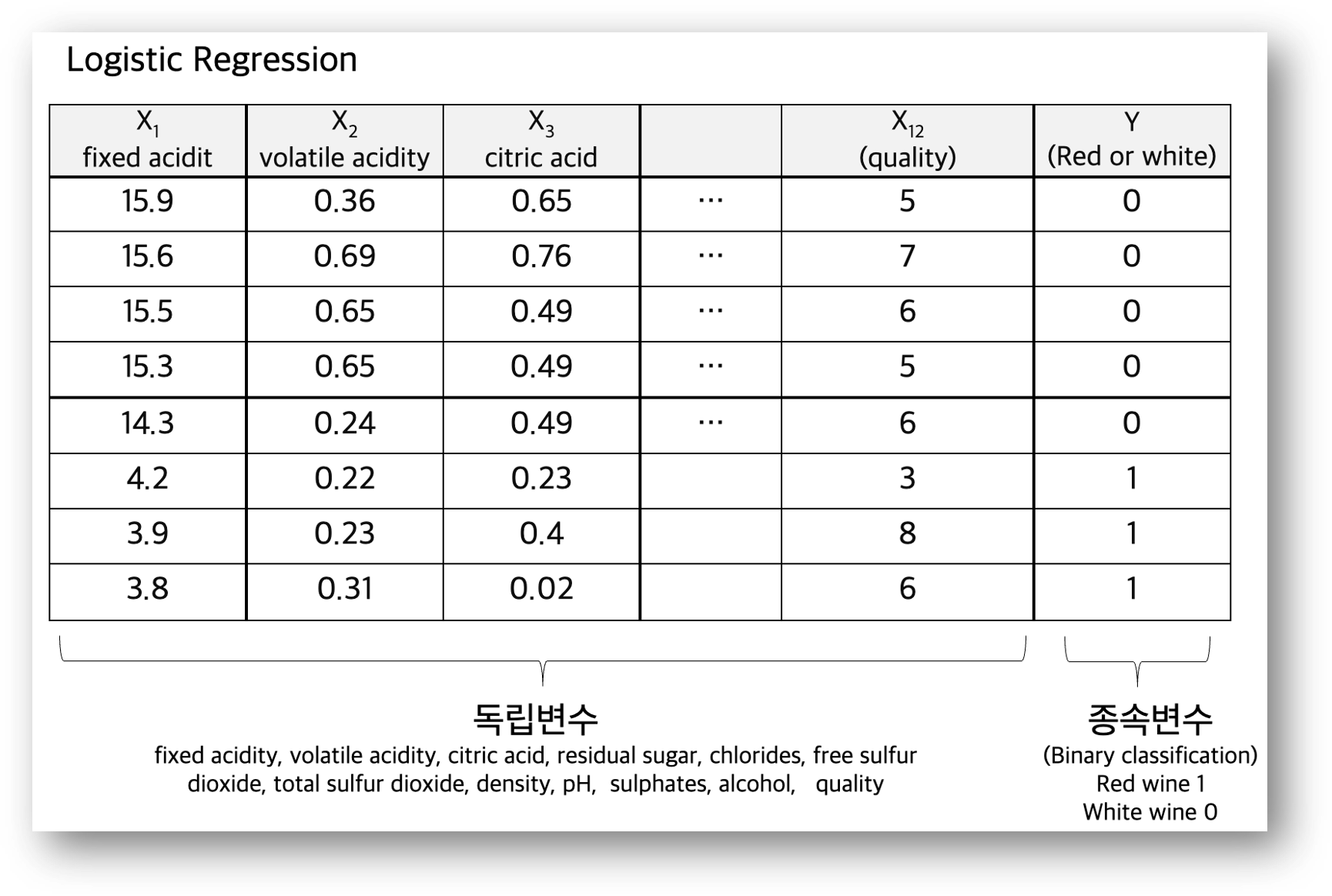 아래 이전 포스팅에서 Logistics regression에 대한 개념과 Keras 예제를 확인하였습니다. 본 포스팅에서 다수의 독립 변수(X)와 단일의 종속 변수(Y)인 Wine Quality 예제를 설명하도록 하겠습니다.