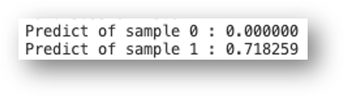 print ('Predict of sample 1 : %f' % (model.predict([x_est1])[0][0]) )