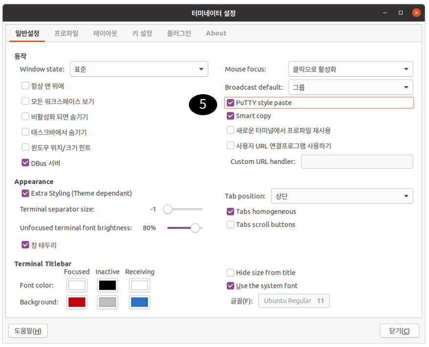 배경화면, 폰트 색상을 결정하였다면 '마지막' 으로 일반 설정에서 'PuTTY style paste' 을 선택한다. 이 메뉴를 선택하면 마우스 오른쪽 키가 paste로 동작하기 때문에 메뉴 설정 진입이 안되기 때문에 맨 마지막에 설정을 해야 한다.