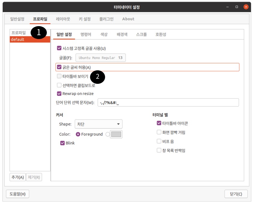 Terminator 환경 설정은 마우스 오른쪽 환경 설정 메뉴을 통해서 진입할 수 있으며, 배경 색상, 타이틀바, 폰트 색생부터 조정한 후에 Copy on slection 기능과 마우스 오른쪽 paste 기능을 enable 한다. 환경을 설정은 진입한 후 1) 프로파일 선택, 2) 타이틀바 off로 설정 3) 내장 색상을 선택, 4) 팔레트에서 원하는 색상으로 변경한다. Terminator의 이중 타이틀(상단 그림에서 회색 영역)을 보이지 않기 위해서 off로 설정하고, 컬러는 각자 취향에 맞는 값을 선택하면 된다.