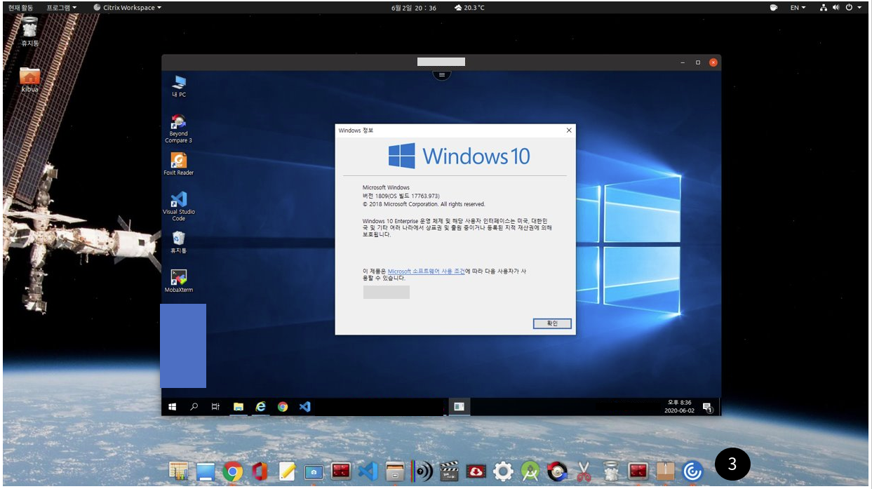 Chome 브라이저에서 Citrix Workspace를 실행 후 회사 클라우드 사이트의 URL을 입력하고 접속합니다. 회사 계정과 패드워드를 입력하면 아래와 같이 Ubuntu 20.04에서 Cloud PC의 Windows 10에 접속을 확인할 수 있습니다.