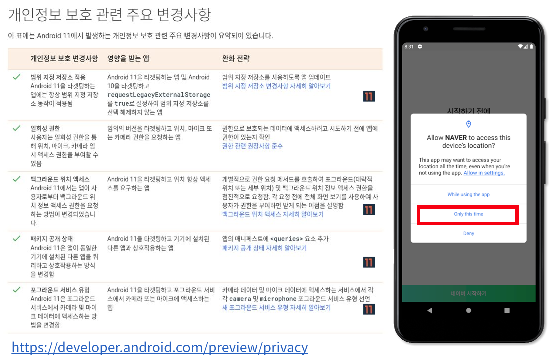I-OS 대비 Android 가 취약하다고 느끼는 점이 '보안(Security)'이다. Android 버전이 올라갈 수 록 보안을 강화는 방향으로 개발되고 있다. Android 11 에서의 보안 강화 내용은 https://developer.android.com/preview/privacy 에 요약되어 있다.
