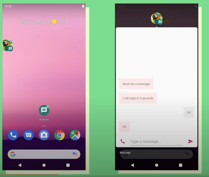- 대화: 행 아웃이나, 메시지와 같은 메신저 프로그램에서 상대방이 메시지를 전달하면 System UI 상에서 바로 회신 및 대화할 수 있는 기능이 강화되었다. 이 기능이 2~3년전 부터 API 가 존재하여 일부 제조사나 메신저 프로그램에서는 간편 회신(1~2줄)은 가능하였다. ( ※ 카카오톡과 같이 '메시지 삭제' 기능이 있는 경우 상대방이 메시지를 삭제하면 카카오톡 앱에서는 메시지가 삭제되더라도 System UI에서는 그대로 남아 있을 가능성이 있다. Android 11이 공식 배포되면 '메시지 삭제' 기능을 확인할 필요가 있다.) Bubbble 기능은 대화창이 홈 아이콘에 표시되고, 선택하면 원래의 대화창이 열린다.