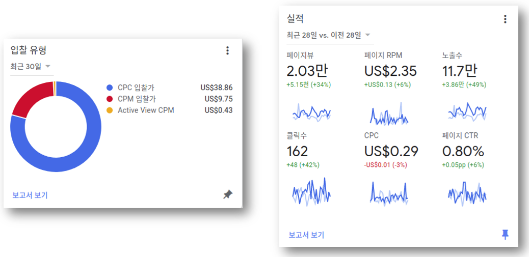 구글 애드 센스 보고서에서는 아래와 같이 CPC 입찰가, CPM 입찰가, Active View CPM에 대한 리포트를 보여줍니다. 이에 대한 CPM과 CPC에 대한 설명을 하도록 하겠습니다. 구글 애드센스에서의 광고 용어집을 참고해주세요.
