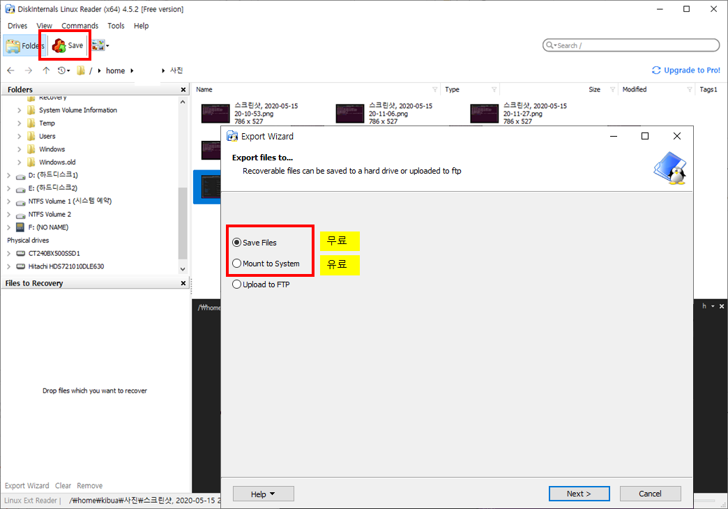 Linux Reader를 EXT 4와 NTFS 로 포맷한 SSD, NTFS의 HDD, FAT 32의 SD Card까지 잘 인식된다. EXT 4 우분투의 특정 폴더나 파일을 선택하고 SAVE 를 실행하면 1) copy, 2) Mount to System, 3) ftp upload를 선택할 수 있다. 무료 버전에서는 1) Copy (파일/폴더 단위)와 3) ftp는 무료이고, 윈도우즈의 2) 드라이브로 마운트하기 라이센스를 구입해야 한다.