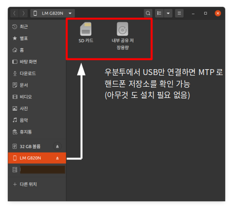 Ubuntu 20.04 설치 상태에서 USB만 연결하고 MTP 가 자동으로 붙는다. 핸드폰의 내장 메모리 및 SD카드 인식이 가능하다. 참고로, 내장 메모리는 EXT4이고, SD카드는 FAT32 파티션이다. 핸드폰 MTP 로 자료을 하시는 분도 많아서 업데이트 했다.