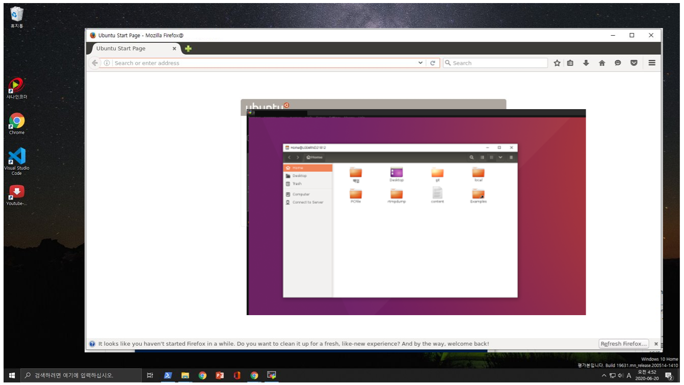 MobaXterm에서 ssh를 통해서 원격 서버에 접속하면 Command line 방식뿐 아니라 GUI 기반의 프로그램도 실행 가능하다. 즉 윈도우에서 리눅스 서버를 연결해서 firefox, chrome, nautils 등의 응용 프로그램을 X-Server를 통해서 실행 가능하다. 기본 설정으로도 X-Server가 사용 가능하다. ssh 접속 상태에서 $ firefox or nautils 를 실행하면 원격 서버의 프로그램이 실행된다.