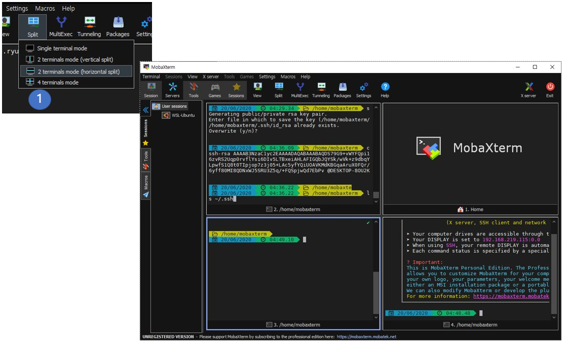 MobaXterm에서 많이 사용하는 기능 중 하나는 Split 기능이다. 여러 개의 터미널 사용이 가능하다.
