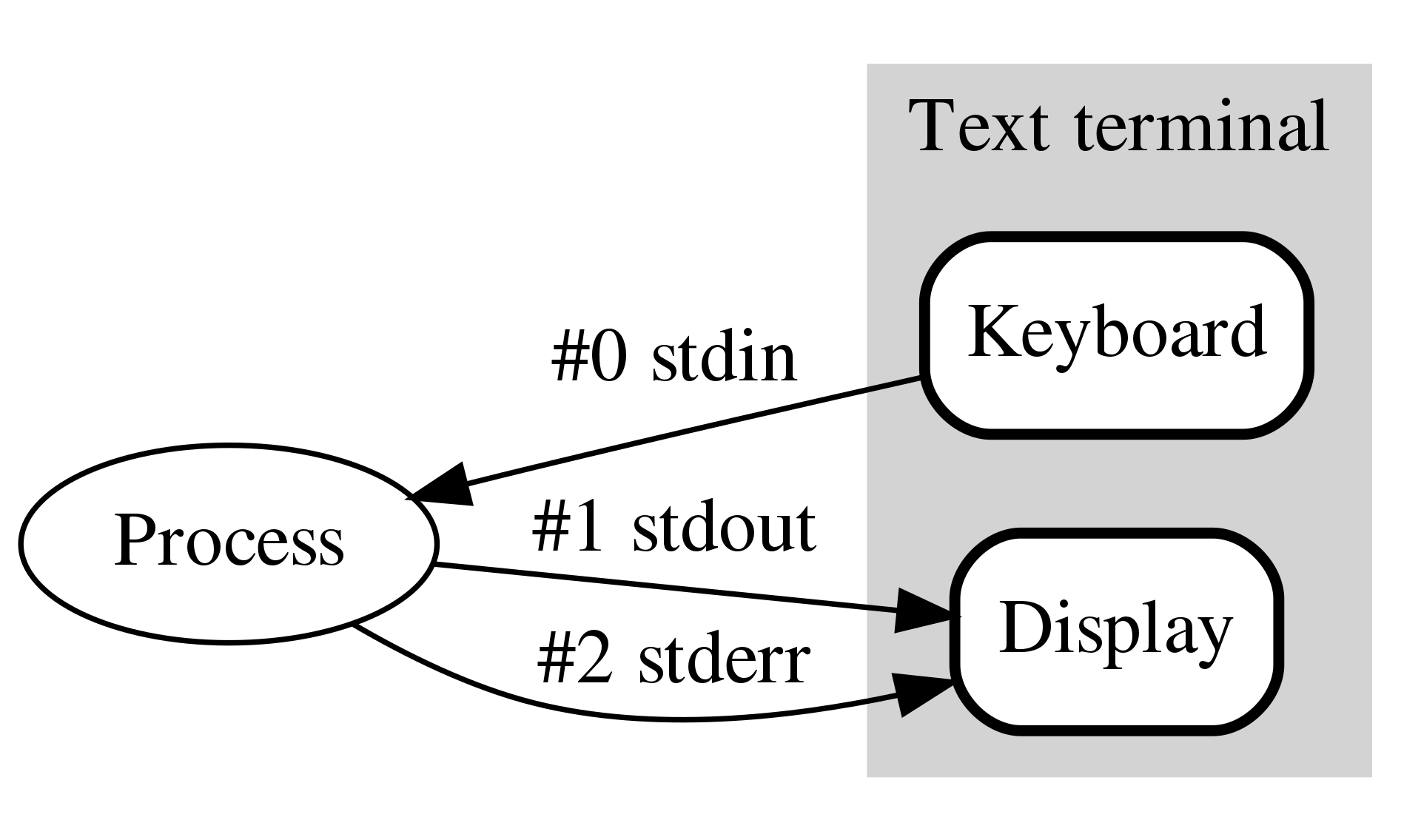 일반적으로 유닉스에서 동작하는 프로그램은 실행 시 세 개의 스트림이 자동으로 열린다. 이를 표준 스트림이라고 부른다. 하나는 입력을 위한 스트림(Standard input, STDIN, 0), 하나는 출력을 위한 스트림 (Standard Output, STDOUT, 1), 하나는 오류 메시지를 출력하기 위한 스트림(Standard Error, STDERR, 2)이며, 이 세 개의 표준 스트림은 사용자의 터미널에 부착된다.