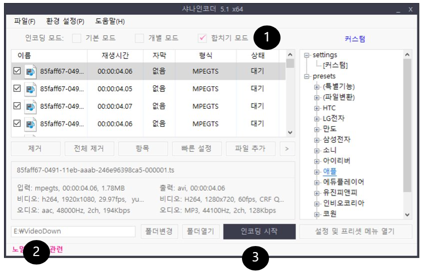 ① ShanaEncoder 최신 버전 설치 후 '합치기 모드' 실행, 동영상 리스트 추가