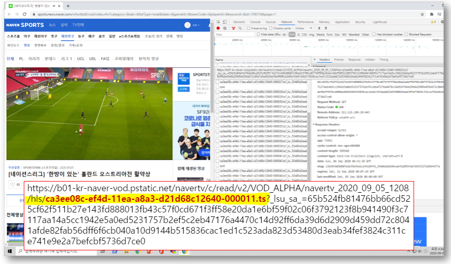 TS 포맷의 동영상 URL 확인하는 방법은 앞서 설명한 Chrome의 개발자 메뉴 (F12) 에서 확인 가능합니다.