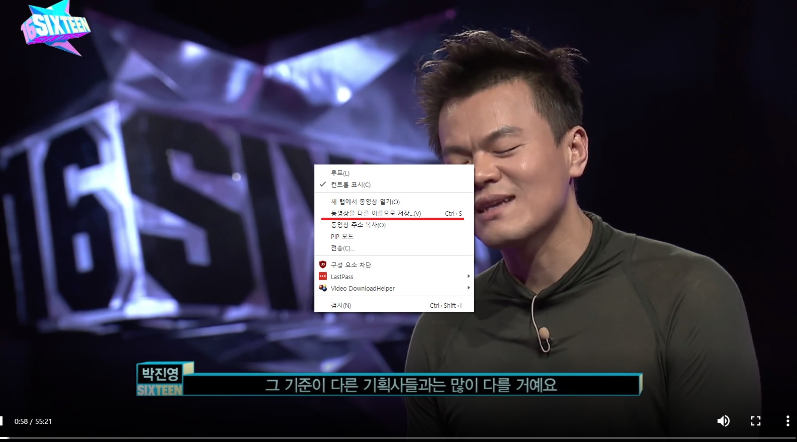 - 4단계에서 재생하고 있는 동영상에서 마우스 오른쪽 메뉴의 "동영상을 다른 이름으로 저장"으로 선택하여 저장합니다.