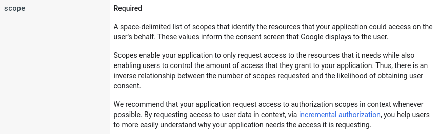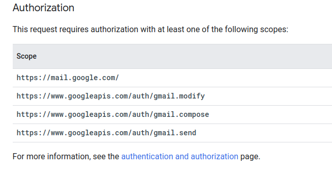 scope: 사용하고자 하는 API를 인증 범위를 의미하며 사용자 로그인 시 scope 에 대해서 명시적 동의를 받는다. 만일 soce에 여러개라면 각각 space로 구분해서 추가할 수 있다. 예를 들어 Gmail의 Users.message:send API는 아래와 같이 명시되어 있다. .