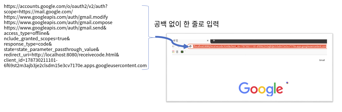 구글의 https://accounts.google.com/o/oauth2/v2/auth 에 URL paramter를 전달하는 단계이다. 아래와 같이 URL 파라미터로 API에 맞게 변경하고 URL을 공백 없이 한 줄로 만들어서 Chrome 브라우저에 URL 값에 입력한다. Chome 브라이저에서 URL 위에 parameter 값을 URL encoding 변환하기 때문에 별도의 URL ending은 필요 없고 공백만 없이 입력 정상 동작한다. 만일 html이나 java script에서 URL을 입력하는 경우 paramter 부분을 URL encode를 수행해야 한다.