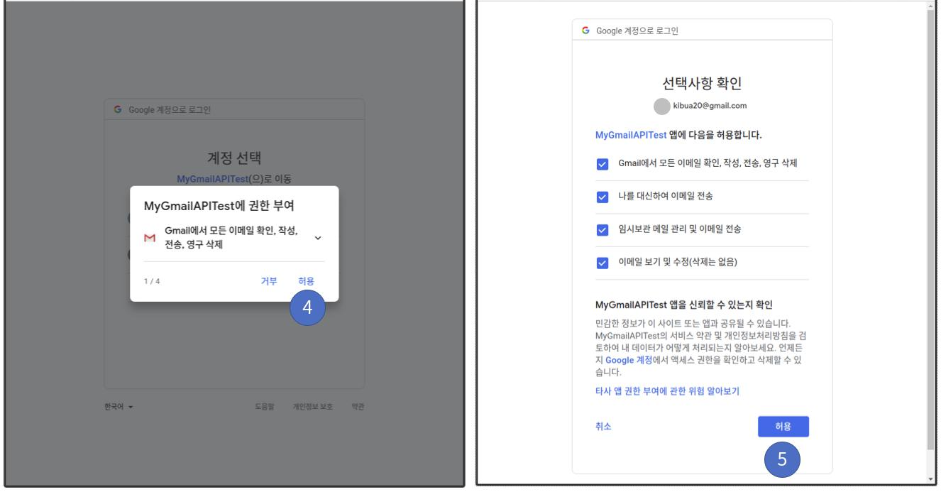 4) 사용자에게 API의 scope에 대한 명시적 동의를 받는다. 설정된 scope에 대한 확인 과정을 진행한다.