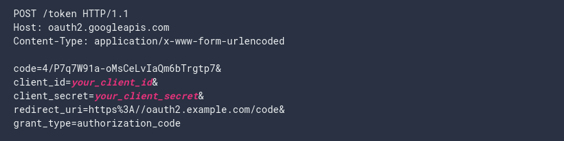 7) 구글 서버에서 code 값, client ID, client_secret, redirect URL, grant type을 설정하여 구글 서버에 https 의 request 전송