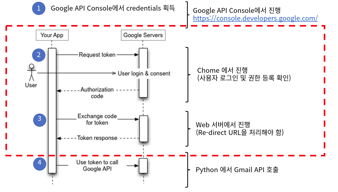 앞선 게시글에서 Google API 콘솔에서 프로젝트를 생성한 후 credential.json을 얻는 방법을 설명하였고, 본 게시글은 아래 그림에서는 붉은색으로 표시한 '구글 인증 서버에 Authoized code를 요청 후 Access toekn을 받는 방법'을 설명하고자 한다.