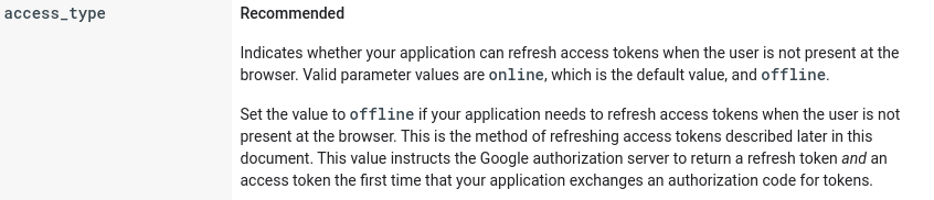 - access_type: online 과 offline으로 설정할 수 있으며 'offline'으로 설정한다. access token은 한 번 받으면 1시간 동안만 유효하고, 유효한 시간에서만 API 호출이 가능하다. access_token을 다시 받기 위해서는 refersh token을 받아야 하고 사용자 로그인 없이 refresh token을 사용해서 access token을 받을 수 있다. 사용자로 하여금 API 사용할 때마다 로그인을 할 수 없기 때문에 refersh token을 얻은 것은 서비스 개발자의 입자에서는 매우 중요하다. (아래 설명 참고)