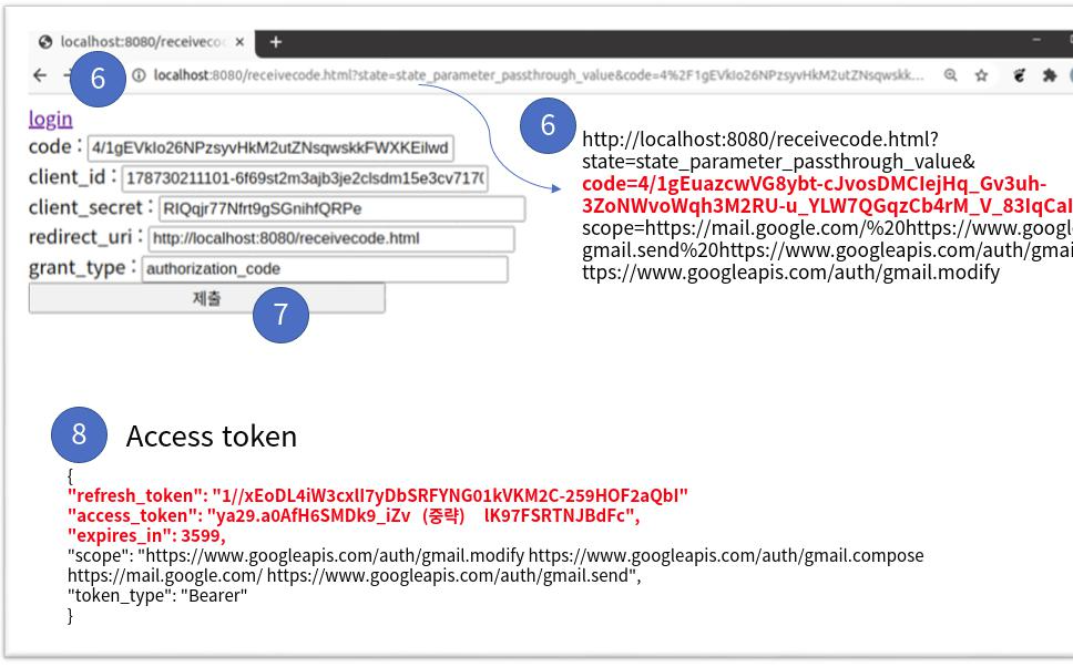 receivecode.html 은 구글 인증 서버에서 내려주는 URL 중 code 값을 찾아서 다시 post 하는 코드이다.