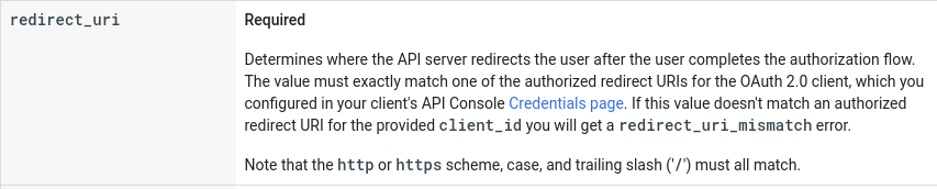 - redirect_uri: 사용자 권한 동의를 구글 인증 서버로 요청하고 Authoization code와 access token을 받을 수 있는 URL을 설정한다. Google API Console에서 추가한 값으로 credential.json 파일에 있는 값을 사용해야 하고, 일치하지 않는 경우 에러가 발생한다.