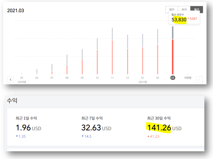 2021년 3월 방문자수는 53,830이고, 애드센스 수입은 140$를 달성하였습니다. 1주일에 1~2개 정도 포스팅하고 있고 포스팅 개수가 작기 때문에 하나를 작성할 때 공을 많이 드려서 작성하고 있습니다. 그 동안 평균 100$ 정도 나오다가 무효 트래픽 2번 걸려서 수입이 줄다가 회복하고 다시 증가하는 추세입니다. 하루 수익이 1$ 나올때도 있고 10$ 나올때도 있어 편차가 있습니다. 수입 증가를 위해서는 방문자가 블로그에서 체류를 오래하고 방문자 수를 꾸준히 유지하면서 우상향으로 조금씩 늘리는 것이 중요한 것 같습니다.