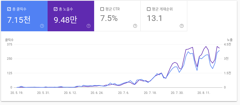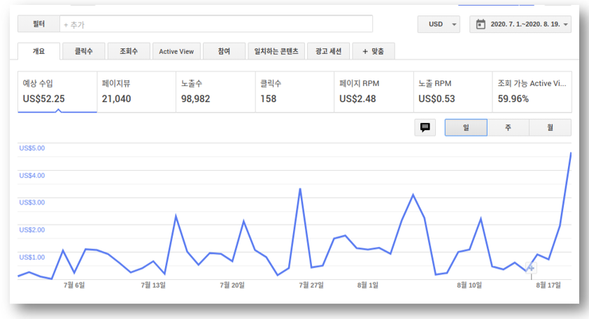 애드 센스 광고 수익은 클릭수에 절대적으로 비례합니다. 7월 대비 8월에는 유입량은 거의 2배이지만, 클릭수는 7월과 8월 결과가 거의 동일하기 때문에 광고 수익 자체는 7월이나 8월이나 거의 비슷합니다. 광고 수익은 하루 단위로 0.1$~4.5$ 정도이고 클릭수가 높은 날은 수익이 따라가 올라가고, 클릭수가 없는 날은 1$미만입니다.
