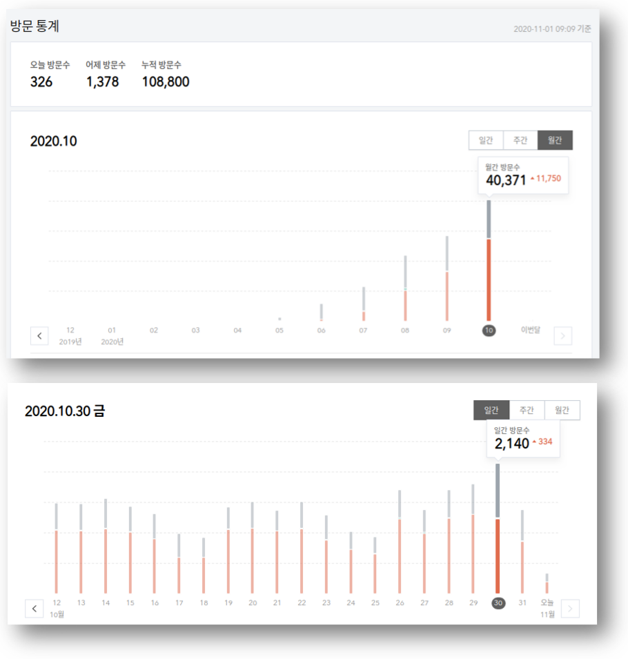 제 블로그의 경우 유입량은 10월 한달 동안 40,000가 넘었고, 하루 방문자는 월~금요일까지는 1,500명은 넘고 주말에는 다소 줄어드는 경향이 있습니다. 가장 많이 방문한 날은 지난 금요일로 2,140명 정도 유입되었습니다. 블로그 유입량은 정말 조금씩 그리고 꾸준히 늘어나고 있습니다.