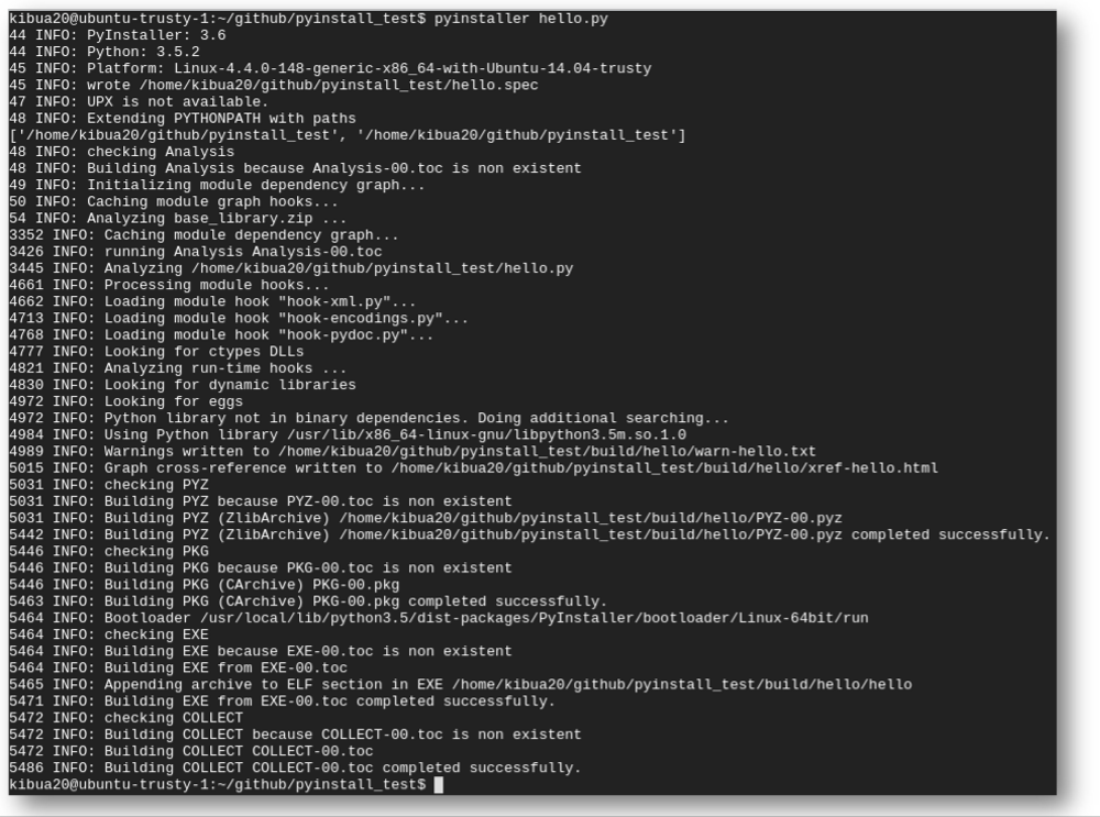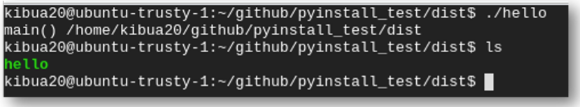 $pyinstaller hello.py을 실행하면 아래와 같이 Py 파일의 종속성을 분석하고 필요한 lib을 /dist 폴더에 copy 합니다 실행 결과는 /dist에 hello elf와 필요한 shared lib가 같이 포함되어 있습니다.